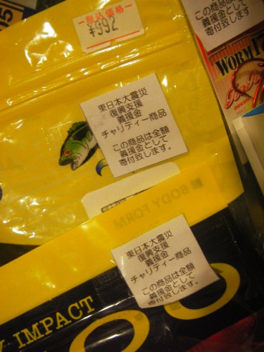 | この度は、 東日本大震災復興支援チャリティー商品として 沢山のお客様から寄付をいただきました。 微力ながらもHAMAとして出来ることをしていきたいという気持ちに ご賛同いただいた皆様、本当に有難うございました。 引き続き、チャリティー商品は募集させていただきます。 ワーム、ルアー、タックルなどなど少量で結構です。 もちろん使ってあるルアー、ワーム、タックルでよいのでご協力お願い申し上げます。 明日5/2(月)朝10時より、 東日本大震災復興支援チャリティー商品の販売をおこなうこととなりました。 販売の復興支援チャリティー商品にはすべてラベルがついております。 お買い上げいただいた金額は すべて東日本大震災復興義援金として責任をもって寄付させていただきます。 お客様から寄付いただいたルアーやワーム、ロッド、リール、 当店スタッフの私物や当店在庫からの寄付商品など 合わせて販売させていただきます。 お買い上げ商品はレジを使わずに募金箱に入れますので、 100円単位の価格となっております。 出来る限りで結構ですので、 お釣りの無いようにお買い物いただけると有難いです。 チャリティー商品は買っていただけるお客様がいて、 はじめて寄付することができますので、 是非見に来ていただけます様ご来店お待ちしております。 |