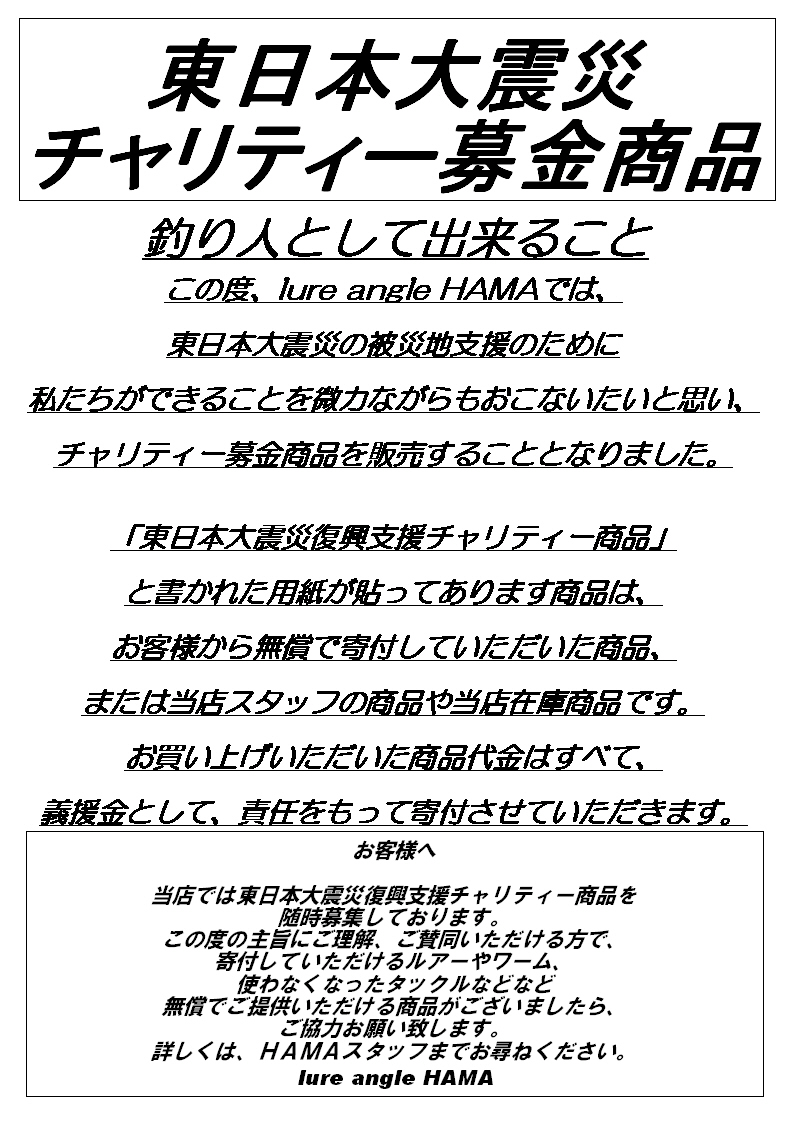 | この度当店では、 私どもルアーショップとして、また釣り人として、 微力でも震災の復興支援ができないものか考えまして、 当店の店頭在庫商品やお客様から寄付していただいた商品を、 復興支援チャリティー商品として販売させていただきます。 お買い上げいただいた商品代金はすべて、 義援金として、当店が責任をもって寄付させていただきます。 またお客様の中で、お手持ちにある使っていないロッドやリール、 ルアーやワームなどを無償で寄付していただける商品を 随時募集させていただいております。 ご協力お願い申し上げます。 集まった商品はHAMA店内で、 「東日本大震災復興支援チャリティー商品コーナー」として、 販売させていただきます。 |