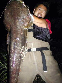 | さてさて、話は変わって皆様は「ビワコオオナマズ」をご存知でしょうか? 日本で最も大きく成長する淡水魚で、名前の通りビワコに生息し 普段は沖のディープで活動しています。 梅雨時にはシャローに上がって産卵をします。 秋もシャローに上がり、冬にそなえて荒食いをします。 私は琵琶湖では結構暗いうちにウェーディングをするのですが、 夜行性の為かねらっている訳でもないのに結構な確率で年中針に掛かってきます。 姿かたちははっきり言ってしまうと「エグイ!」。しかし何度もご対面すると 不思議なもので結構にくめないヤツなのです。 今年初のビワコオオナマズが釣れたのは6月19日。 あまり風もなく、ホタルが飛び交うのどかな夜。 いつものウェーディング釣行で2ヵ所ほど場所を変えた後、 シャローにいるベイトの大きさがかなり小さいのを考え、11cmミノーから7cmミノーにチェンジ。 1投目で「ブシュ」と着水バイト。ドラグがジジーッと鳴りかなり沖に走られ、 首をガンガン振っているのでナマズだ!と思いながらこらえていると フックを外されたようで、急に抵抗がなくなりました。 |