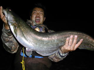 | フッキングが甘かったのかと嘆きながら(ここで既にもうバスはねらっていない(^^;)、 少し伸ばされたフックを直し2投目。今度は「ゴボッ」とバスっぽい捕食音。 ナマズの後なので軽々と上がってくる感じです。目の前まで寄せると45cmはありそうなバス! と思いきや、ジャンプ一発またも痛恨のバラシ。 「なんとも下手くそだなぁ」と思いながら3投目。 またも見事に、7cmの小さなミノーにこれでもかという程の、 大岩を水面に投げこんだかと思うくらいの大きな音のバイトが! 期待を裏切らないすごい引き。糸はどんどん持っていかれ沖へ沖へと走っていく。 30mぼと行ってからようやく止まり、ポンピングで徐々に寄せる、走られる、寄せる、走られるを 繰り返しながら(何せ、スピニングにナイロンライン6LBなので...)、 やっと大きなナマズヘッドを掴んで岸によせると、125cmのオオナマズでした。 バスとは明らかに違う強烈な引きと、暗闇から引きずり出した怪獣といった感じです(^^) 琵琶湖へ釣りに行く方は1度は体験してみる価値ありの魚です! (因みに、ナマズ道の間では、130cm以上からがランカーサイズだそうです) それでは、次回の「浜話」も是非読んでください! |