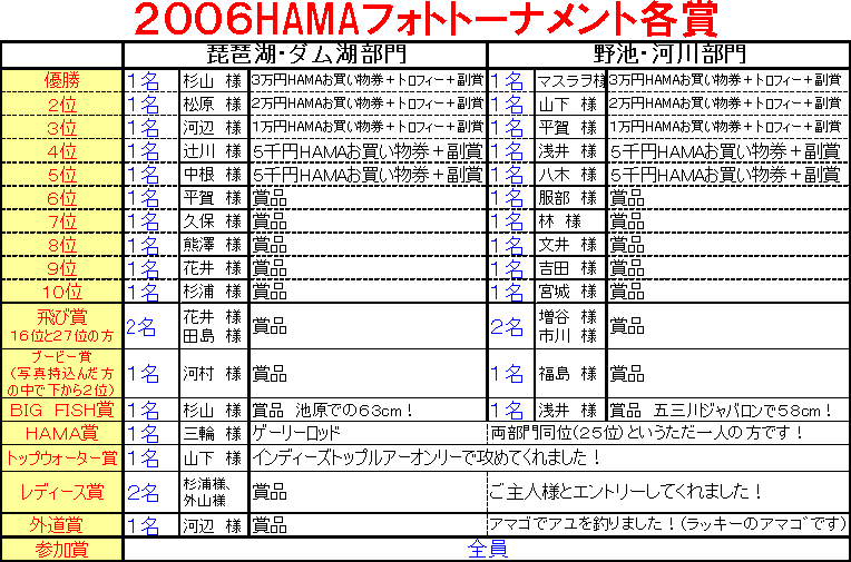 | 協賛メーカー・問屋&協力者様 アカシブランド様、UNCLOUD様、イマカツ様、ウスグモ様、エコギア様、エバーグリーン様、 オーナー様、カツイチ様、ガウラクラフト様、ガマカツ様、ガンクラフト様、クレバー様、 ゲーリーインターナショナル様、サンライン様、ジャッカル様、sense of wild様、双進様、 谷山商事様、チャイルドハート様、常吉様、2tone様、deps様、10FtU様、テングベイツ様、 ティムコ様、中央漁具様、デュエル様、東レ様、ハートマン様、ヴァガボンド様、バスポンド様、 ヒヨコブランド様、Fivesense様、フロッグ様、藤本商店様、ポップマン様、明邦様、メガバス様、 モンマルシェ大同店様・ラパラジャパン様、リングスター様(五十音順) この場をお借りしてお礼申し上げます。有難うございましたm(_ _)m すべて景品に還元させていただきました。 そろそろ今年のフォトトーナメントも考えねば。 詳細決定しましたら募集しますので是非皆様エントリーくださいね〜〜 それではまたよろしければ覗いてみてください! 2007.1.14 nami |